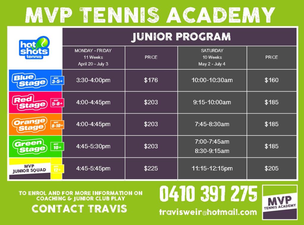 MVP Tennis Academy offers junior coaching classes for all ages and standards, both in groups and individually.